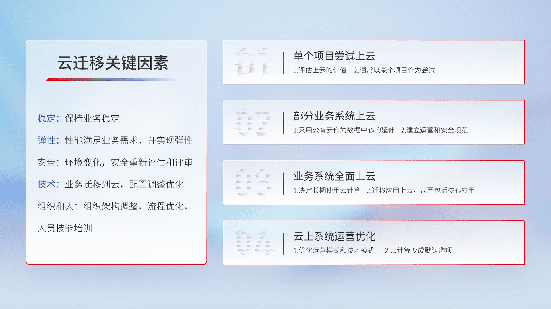 结合实际业务,,,,从规划设计、、、云平台选型、、云原生改造、、、、数据迁移、、集成交付,,,,迁移全过程为客户识别最佳上云路径,,,做好风险识别管理,,设计网络架构、、、、身份权限、、、安全审计合规、、、操作审计、、、日志审计、、监控告警策略、、多站点容灾设计等,,对云上基础设施进行整体规划,,提升IT治理水平,,以满足弹性、、高可用、、高性能的需求。。。。