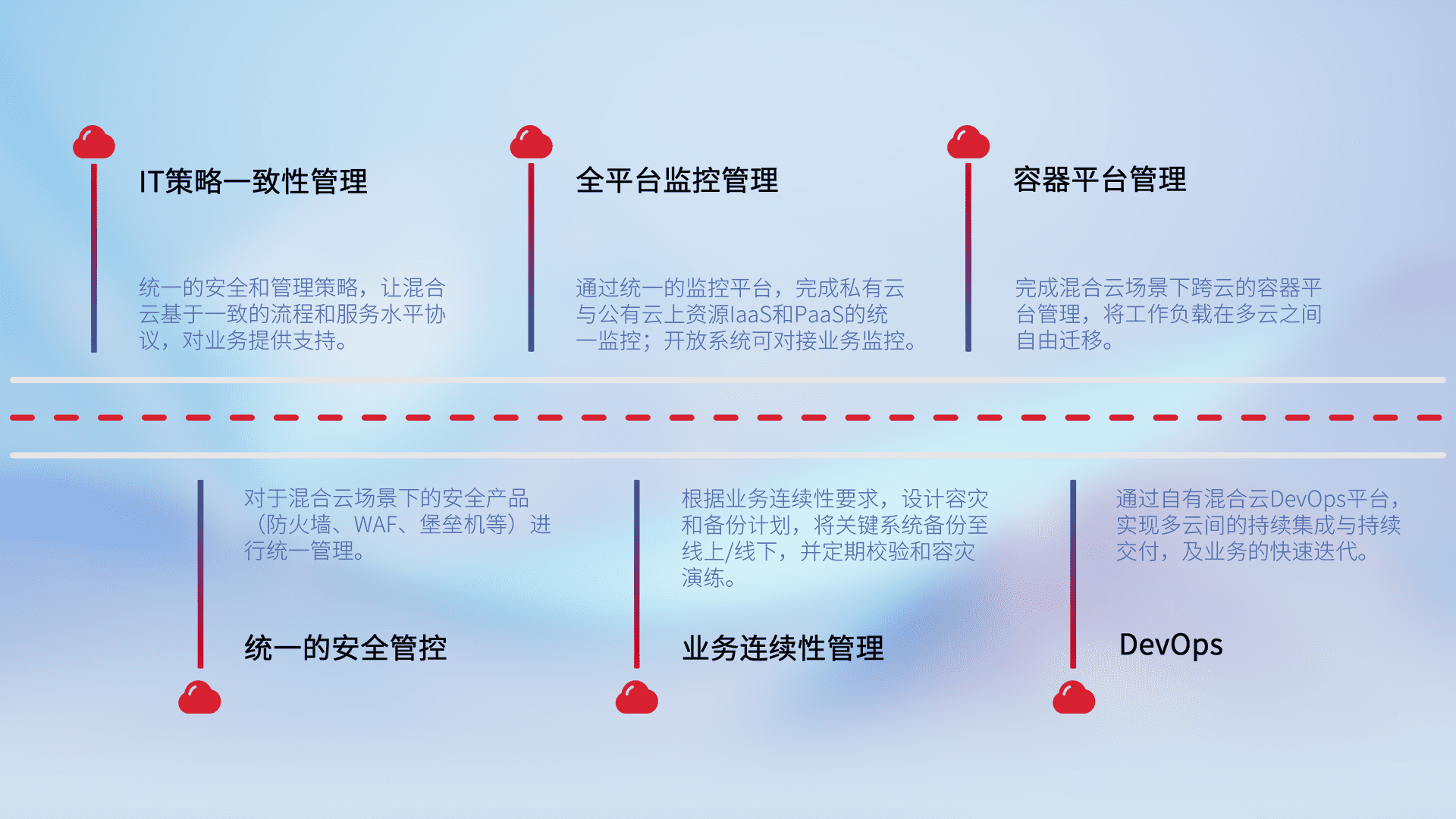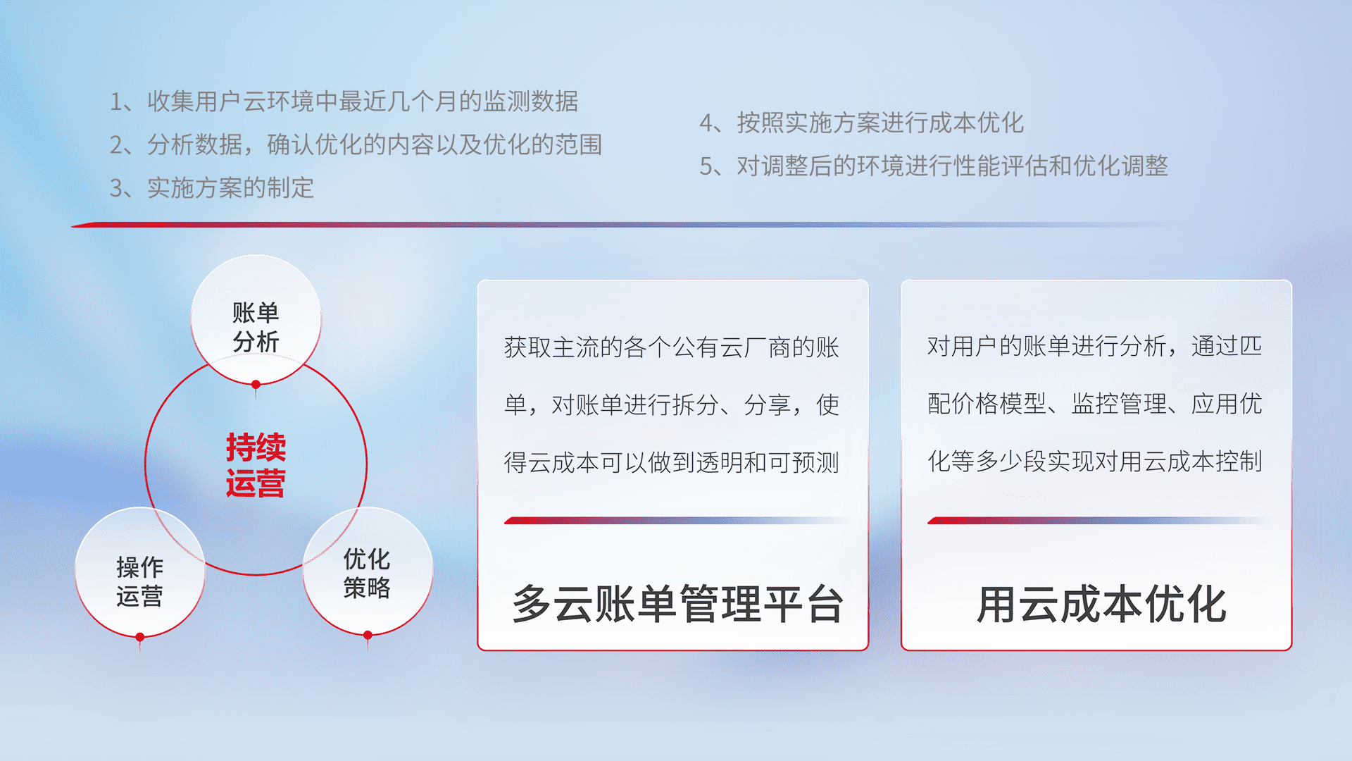 通过多云纳管,,,,以统一的资源数据模型把客户的云资源进行抽象和封装,,进而实现对多云资源的统一操作,,,,保障云资源管理的可靠性、、、、稳定性与可用性。。量身定制化运维内容,,,配置、、、、开发运维、、、补丁管理、、、备份、、监控、、、认证和访问管理、、、审计和日常巡检等,,,,保障在用云过程中的可靠度,,,,稳定度以及高可用率。。