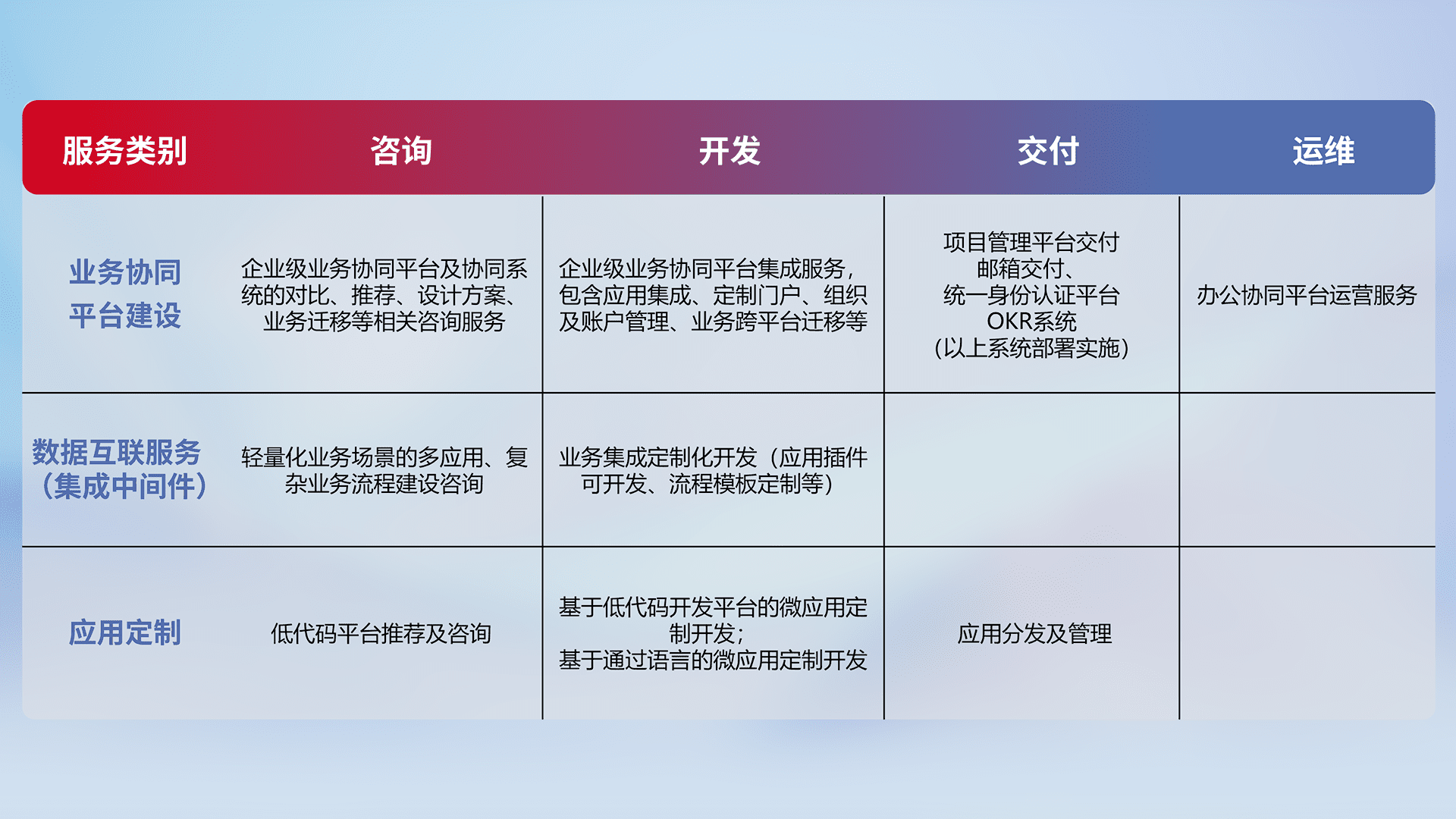 针对钉钉、、、企微、、、IDaas等平台级产品提供产品的规划、、、方案、、交付、、、、定制化开发等服务,,实现如统一协同办公、、智能客户服务、、、混合会议管理、、、智能数据查询、、、等业务场景,,,,实现数字化转型。。。。
